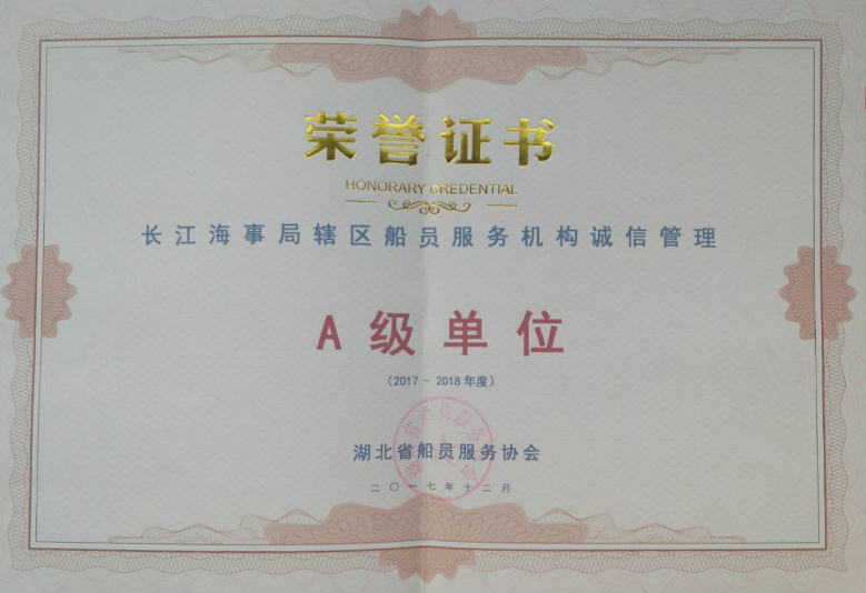 根據(jù)交通部和長江海事局關(guān)于誠信建設(shè)的要求和安排,湖北省船員服務(wù)協(xié)會(huì)對(duì)長江海事局轄區(qū)的海員外派機(jī)構(gòu)和甲級(jí)海員服務(wù)機(jī)構(gòu)進(jìn)行2017年度誠信管理評(píng)審,我公司榮獲A級(jí)誠信管理單位。