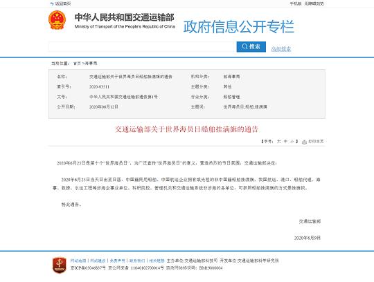 交通運輸部關于世界海員日船舶掛滿旗的通告